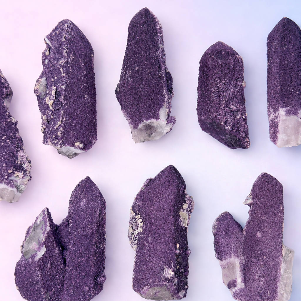 Purple Fluorite is strongly connected to the third eye and crown chakras, supporting intuition, spiritual awareness, and higher consciousness. Candle Quartz is believed to work with all chakras but especially supports the crown chakra. Together, this pairing is thought to align the mind with higher wisdom while keeping energy grounded and structured.
